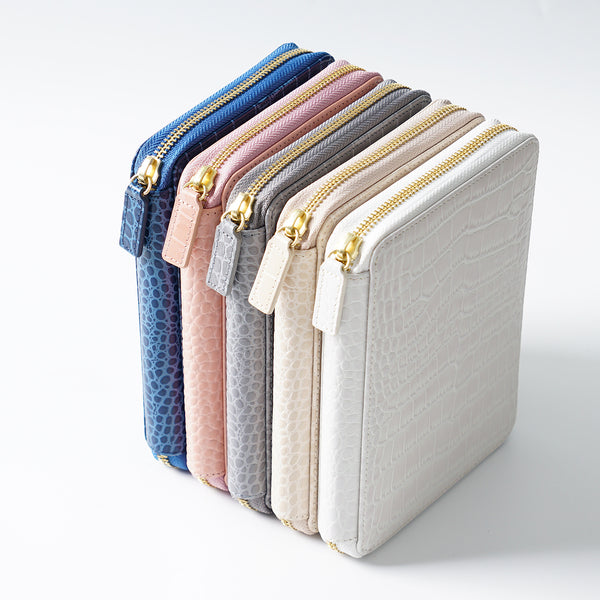 Croc/ New Croc Grain Leather: Pink, Grey, Taupe, Blue Croc. Pearl.